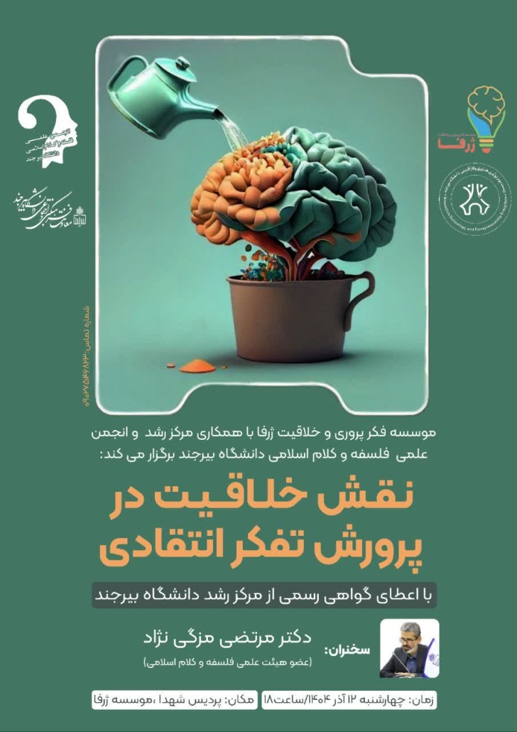 موسسه فکر پروری و خلاقیت ژرفا با همکاری مرکز رشد و انجمن علمی فلسفه و کلام اسلامی دانشگاه بیرجند برگزار میکند: